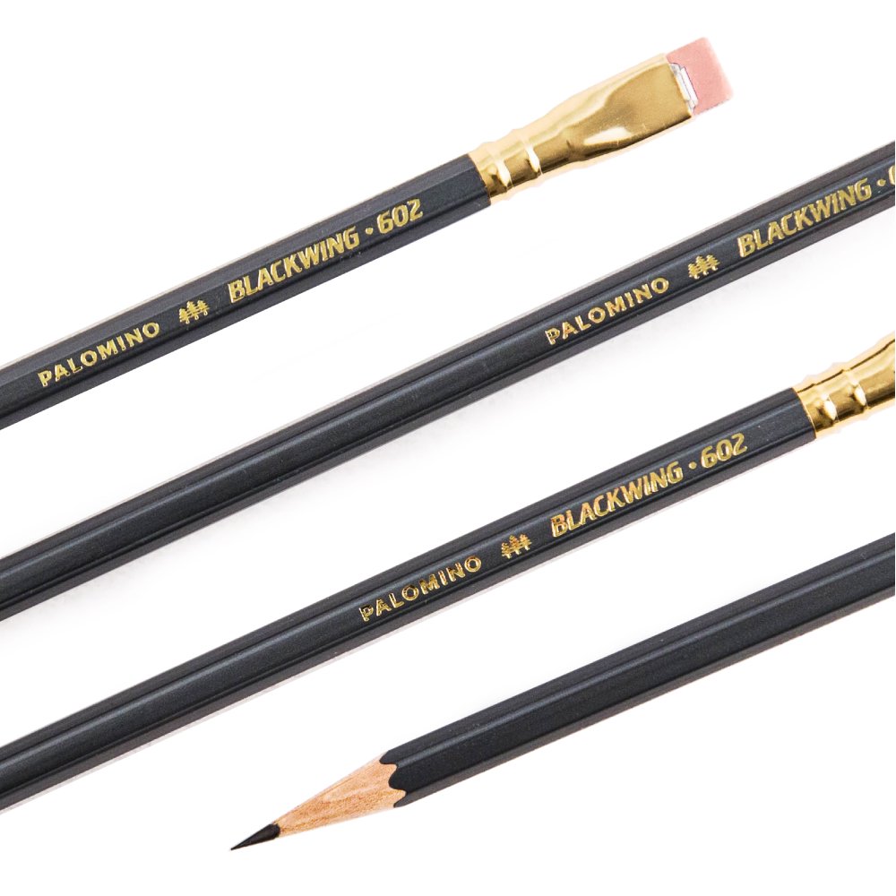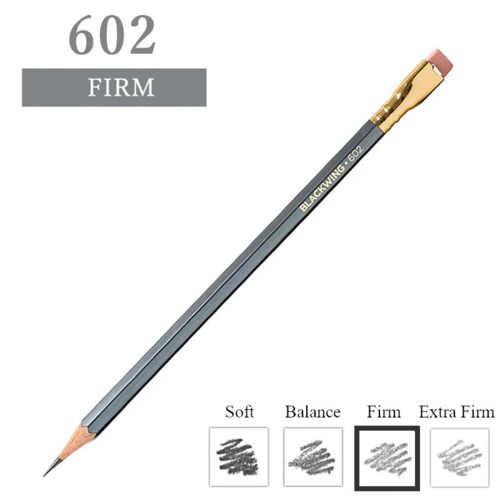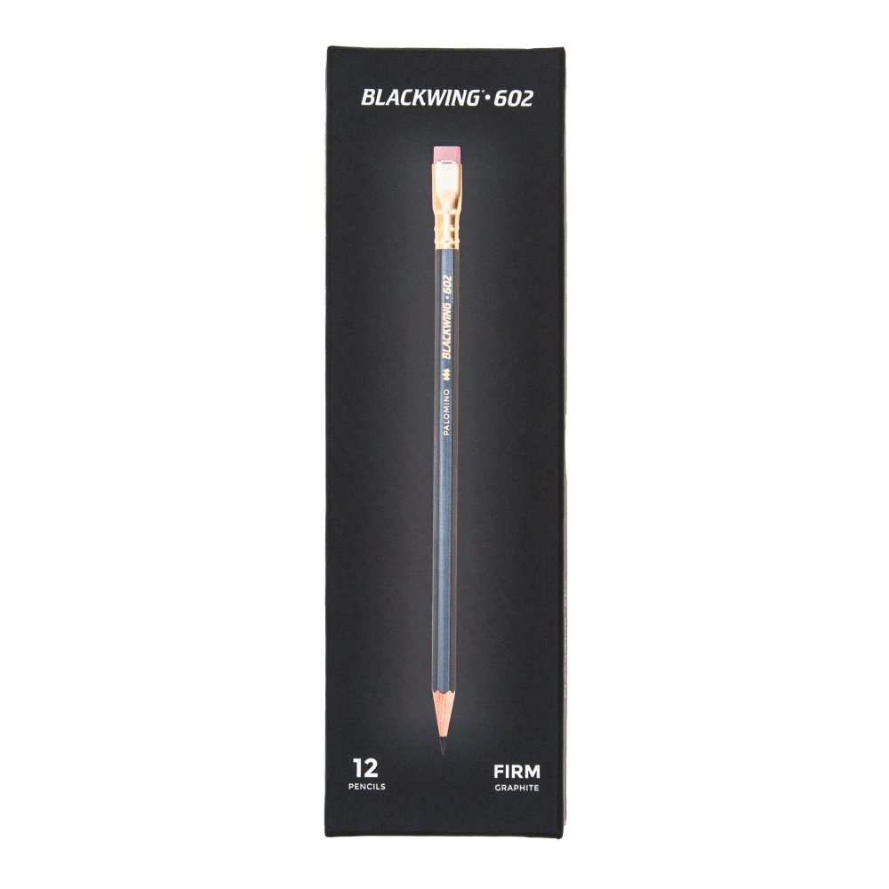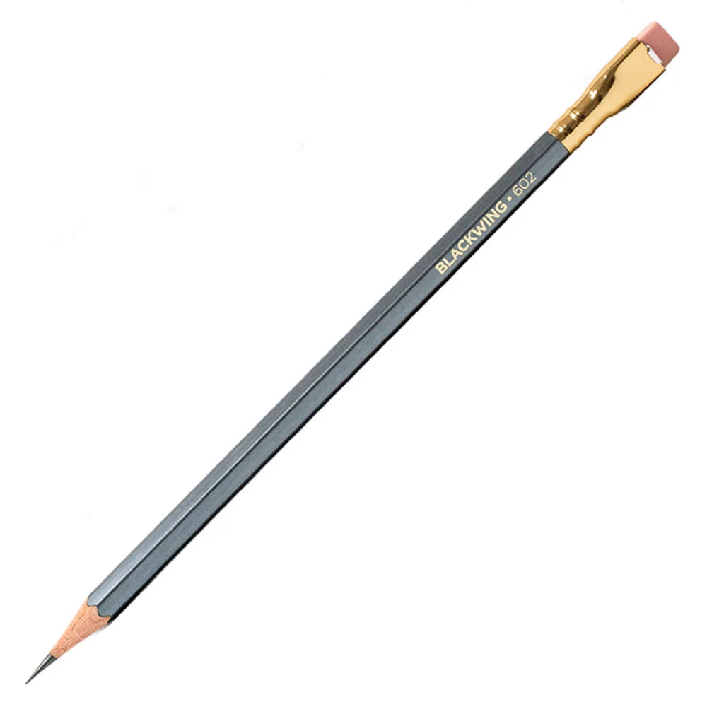 The Blackwing 602 features a firm and smooth graphite core that helps it deliver on its promise of “Half the Pressure, Twice the Speed,” a gunmetal grey finish and iconic square Blackwing ferrule with a pink eraser.