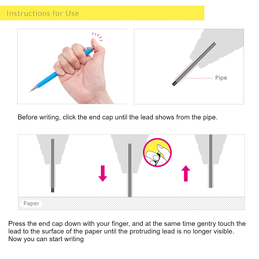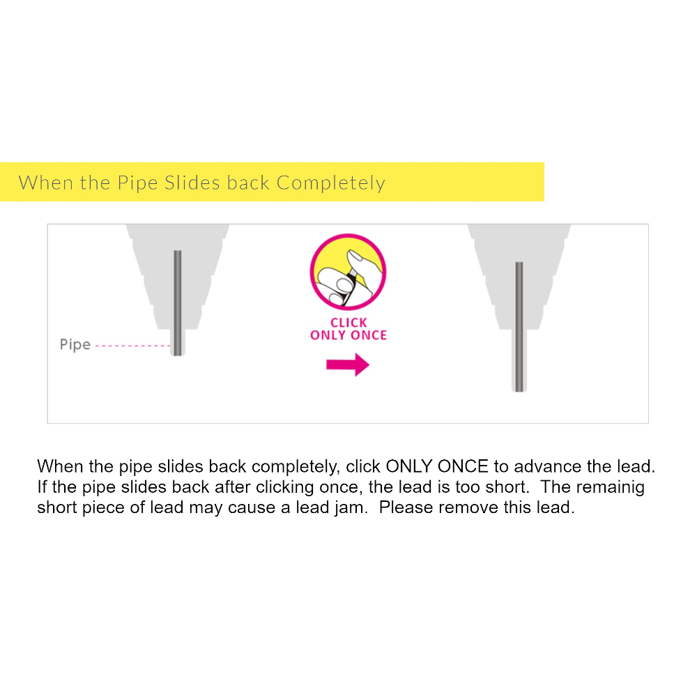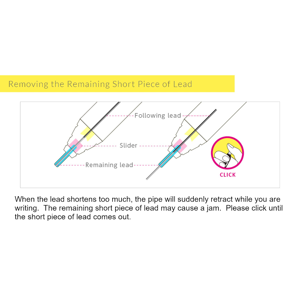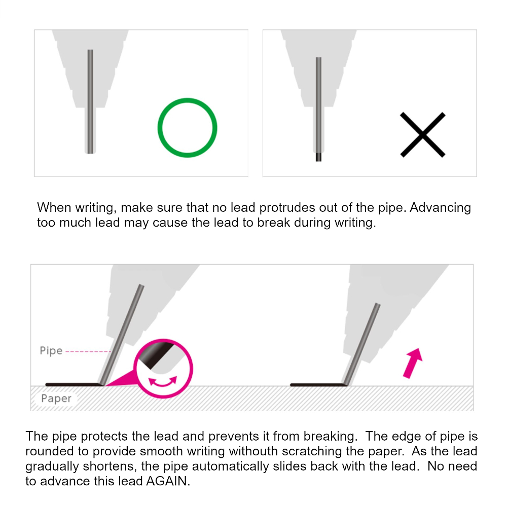 No more knocking (clicking) the top whilst writing. Continuous, uninterrupted, writing as long as the lead lasts.