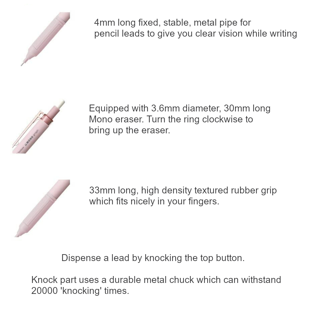 A 3.6mm diameter, 30mm long, replaceable, Mono eraser is located at the top of the pencil. *A replacement eraser pack (3/pk) for Mono Graph Lite is available from our shop.