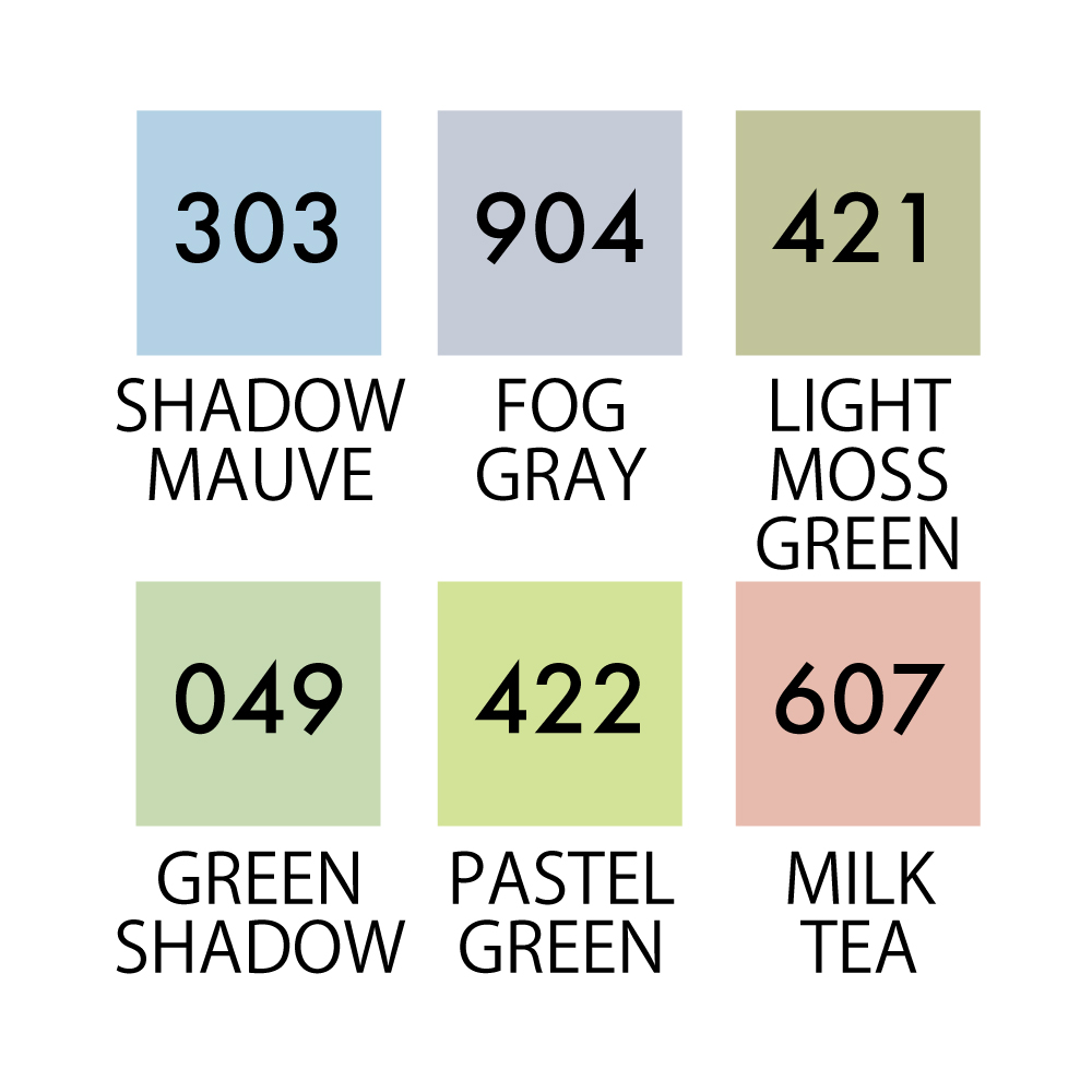 Colors include in 6 set : 303 Shadow Mauve, 904 Fog Gray, 421 Light Moss Green, 049 Green Shadow, 422 Pastel Green and 607 Milk Tea