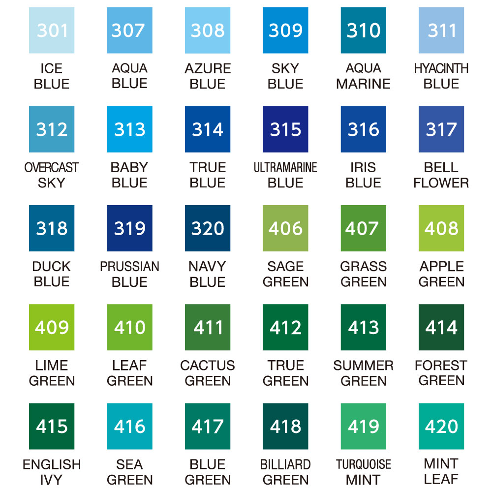 301 Ice Blue, 307 Aqua Blue, 308 Azure Blue, 309 Sky Blue, 310 Aqua Marine, 311 Hyacinth Blue, 312 Overcast Sky, 313 Baby Blue, 314 True Blue, 315 Ultramarine Blue, 316 Iris Blue, 317 Bell Flower, 318 Duck Blue, 319 Prussian Blue, 320 Navy Blue, 406 Sage Green, 407 Grass Green, 408 Apple Green, 409 Lime Green, 410 Leaf Green, 411 Cactus Green, 412 True Green, 413 Summer Green, 414 Forest Green, 415 English Ivy, 416 Sea Green, 417 Blue Green, 418 Billiard Green, 419 Turquoise Mint and 420 Mint Leaf