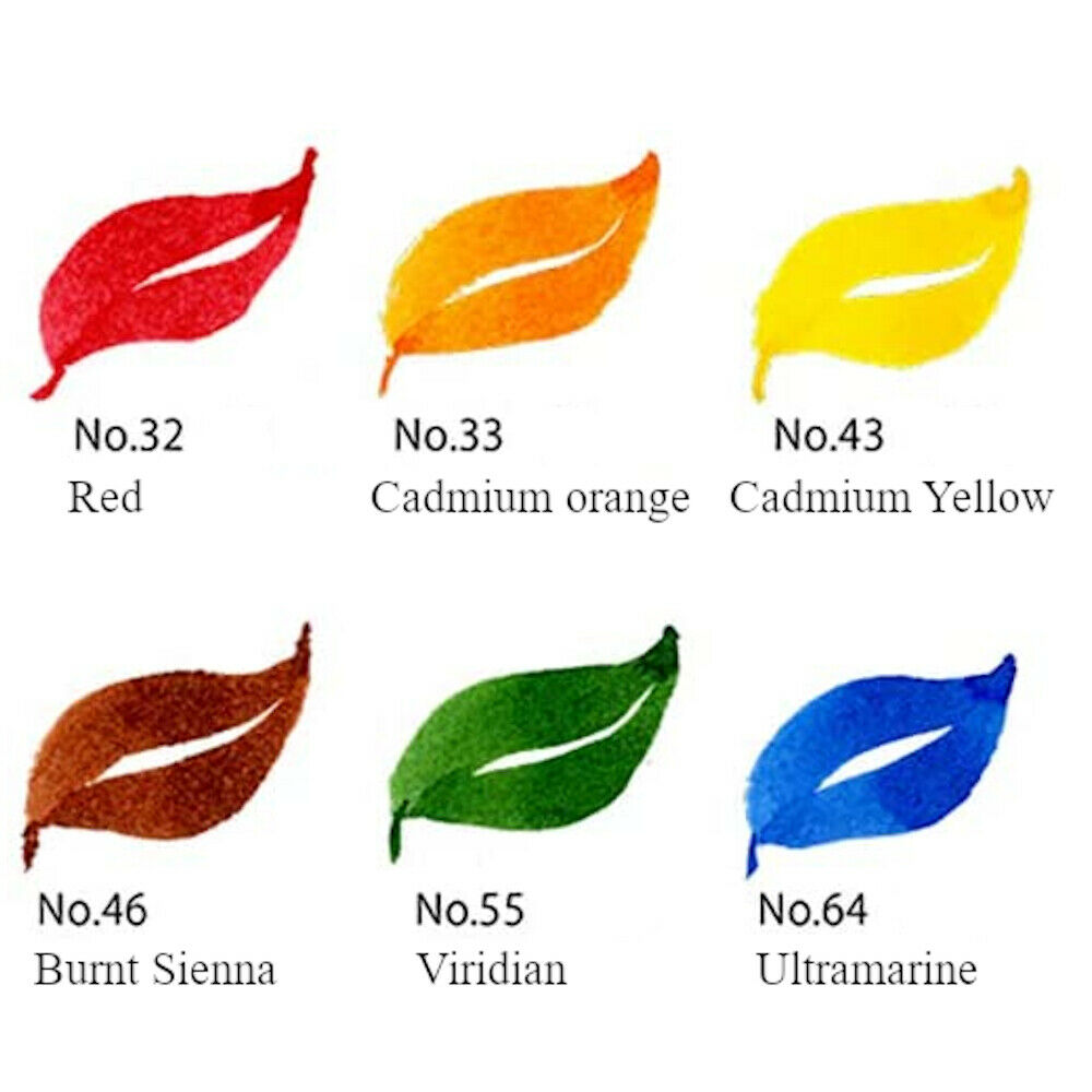 Contents : Red (32), Cadmium Orange (33), Cadmium Yellow (43), Burnt Sienna (46), Viridian (55), Ultra Marine (64)
