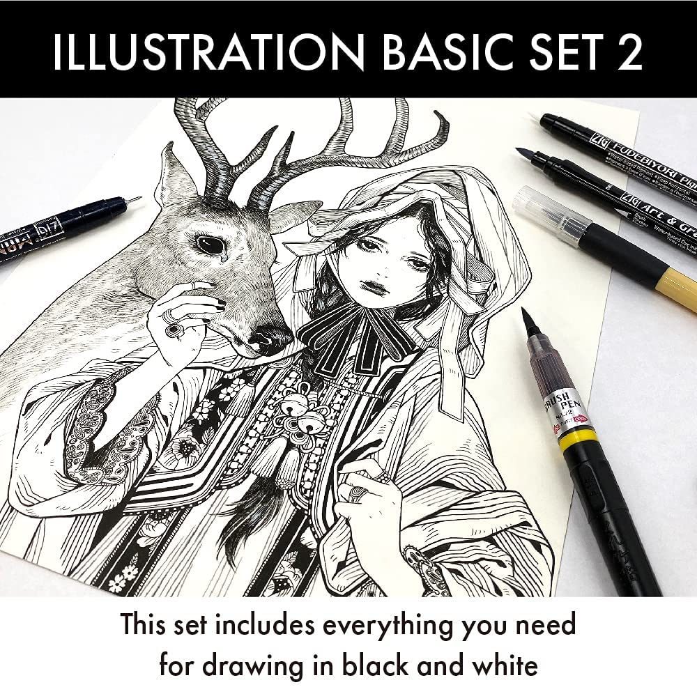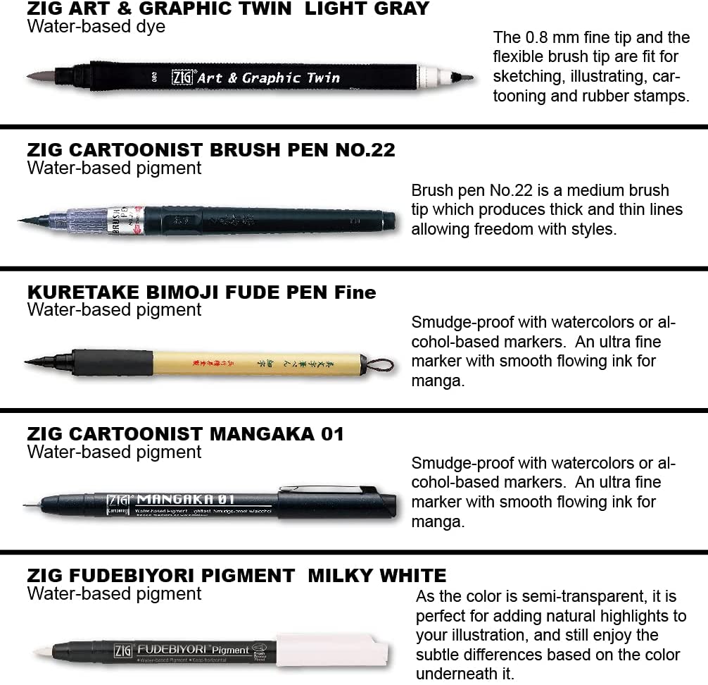 This combo set of five brushes and pens is recommended for those artists who are just starting out in the world of illustration.