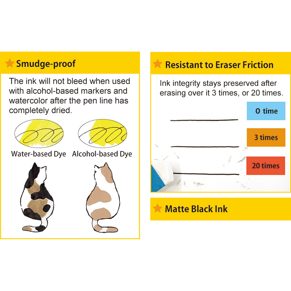 *Please note: Even this ink is smuge-proof, if you rub ink surface hard enough with marker or brush, this may cause peeling of the ink from the paper. This will apply using with eraser. Hard rubbing on surface of ink by eraser may cause peeling of ink from the paper.